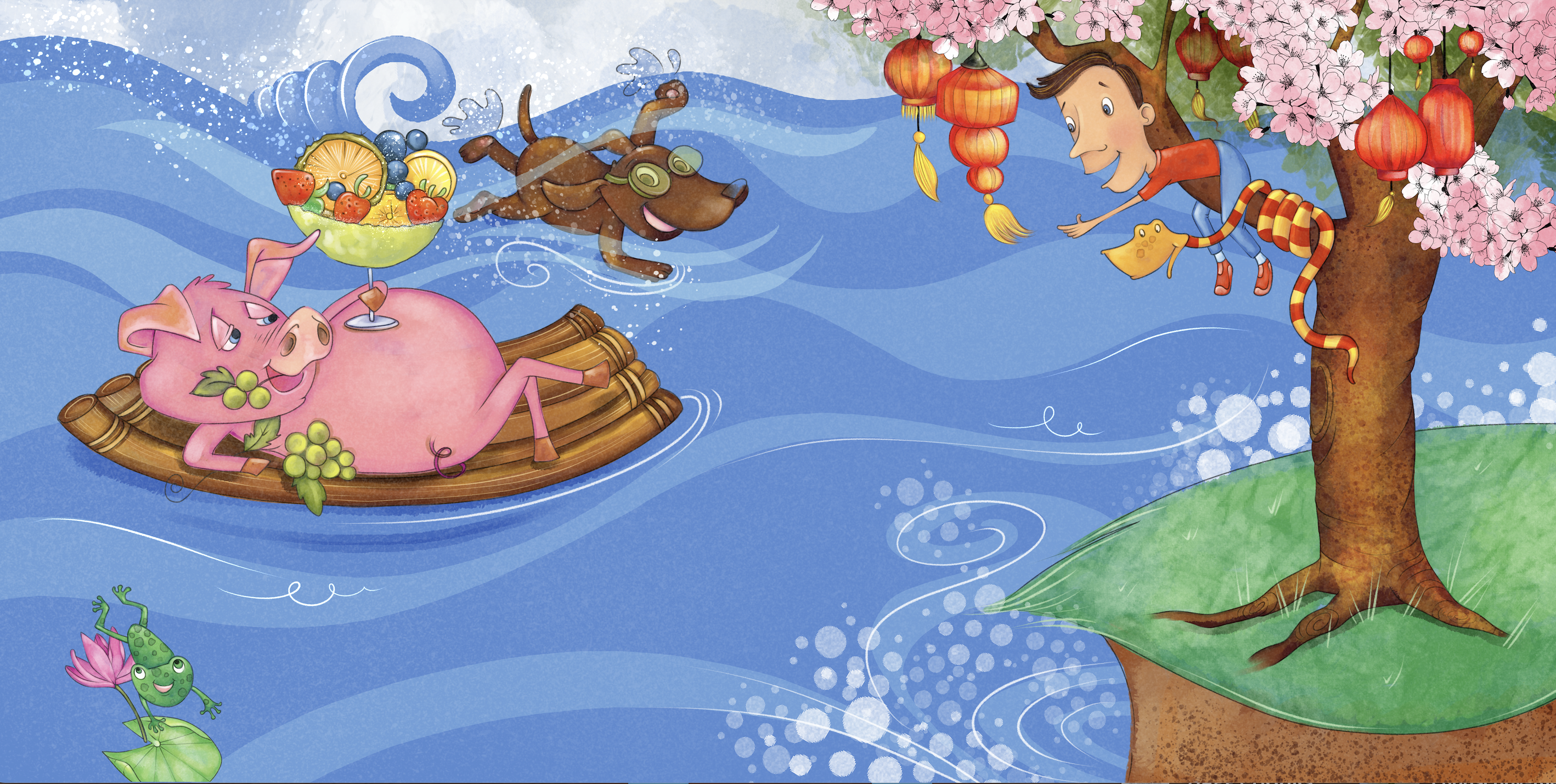 After returning from their adventures exploring USA, Fred went back to school with Perdy and Jack. They met two Chinese kids, Connor and Ellie, who reminded Fred that 2025 is the year of the snake in the Chinese Zodiac calendar. They told him how it all came about with the Jade Emperor challenging 12 animals to a great race to determine the sequence of years. They tumbled over each and across the river to the Heavenly gate. All went well and they celebrated Chinese New Year with a Dragon and Lion dance and a traditional feast.